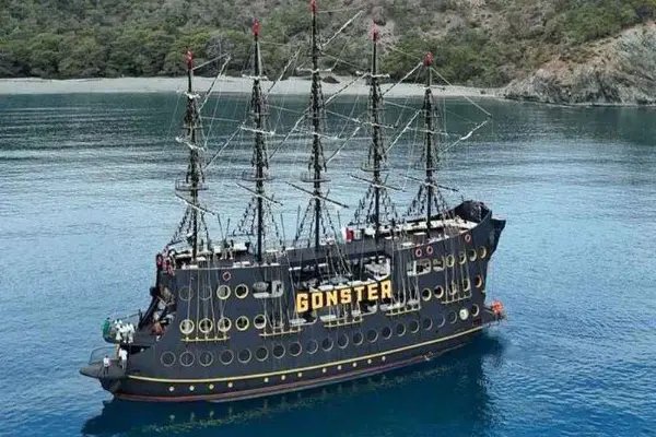 After hotel pickup from Kemer and surrounding areas, you’ll board the majestic 4-deck Gonster pirate ship at Kemer Harbour. As the ship sails into the turquoise waters of the Mediterranean, enjoy your first swim stop at Paradise Bay, surrounded by pine-covered cliffs.